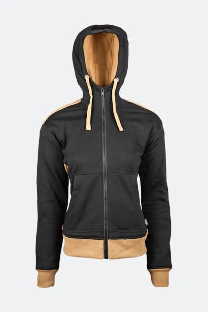 La felpa da moto con cappuccio Panda di GMS può sembrare una felpa normale ma è progettata per la guida. È realizzata in misto cotone e poliestere, con fodera interna e fodera protettiva in fibra aramidica. Il cappuccio ha un cordoncino regolabile ed è rimovibile, quindi è una felpa può essere indossata anche senza. Ha protezioni su gomiti e spalle ed ha una tasca predisposta per poter inserire il paraschiena.